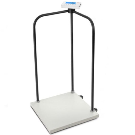Waga podłogowa z poręczami ułatwiającymi pomoc osobom niepełnosprawnym. Platforma niskopoziomowa umożliwia łatwy dostęp. Zasilanie sieciowe i akumulatory. Dzięki kółkom platforma jest mobilna.
