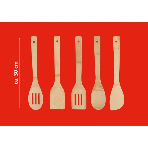 Zestaw 5 przyborów kuchennych z pojemnikiem, wykonanych z drewna. W zestawie znajdują się: szczypce, łopatka, łyżka do mieszania, łyżka do odcedzania, łyżka do makaronu oraz pojemnik do przechowywania.