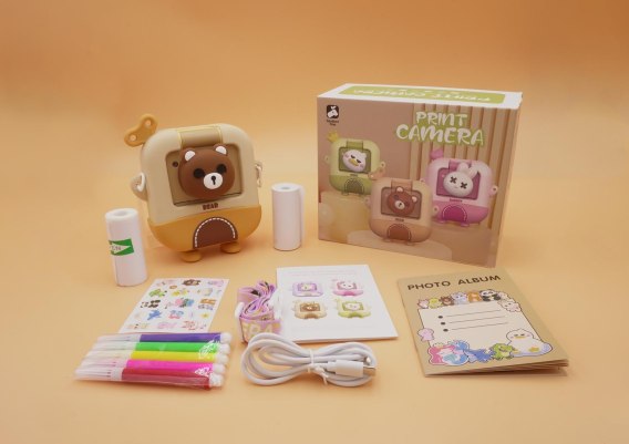 Zestaw aparat fotograficzny z funkcją natychmiastowego drukowania termicznego i akcesoriami dla dzieci od trzeciego roku życia. Aparat po zrobieniu zdjęcia natychmiast go drukuje w kolorze czarno białym. Do zestawu dołączono kolorowe pisaki, by twoja pociecha mogła pokolorować wydruk. Aparat posiada wejście na kartę TV, by Twoja pociecha mogła przechowywać wszystkie zdjęcia i filmy, gdyż model ten ma również funkcję nagrywania. Do zestawu, prócz wcześniej wymienionych pisaków dołączono również 2 rolki termiczne, kabel do ładowania, smycz, naklejki, albumik na zdjęcia. Aparat zasilany jest akumulatorem typu 3,7 V (w zestawie).