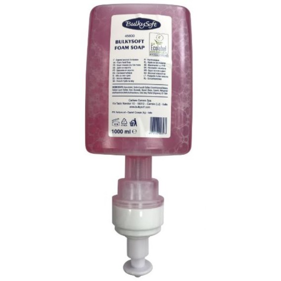 Mydło w pianie Bulkysoft 1000 ml. Pasuje do dozownika Bulkysoft, stanowią komplet do utrzymania higieny. Można stosować w pomieszczeniach z dużym natężeniem ruchu, także publicznych łazienkach. Mydło dzięki zastosowaniu technologii piany jest bardzo ekonomiczne, nie trzeba często wymieniać wkładu z zapasem. Piana posiada wzorowe właściwości myjące i przyjemny, malinowy zapach. Wymiana wkładu w dozowniku nie wymaga czasu i narzędzi. Skóra po umyciu rąk jest przyjemna, pachnąca i miekka.