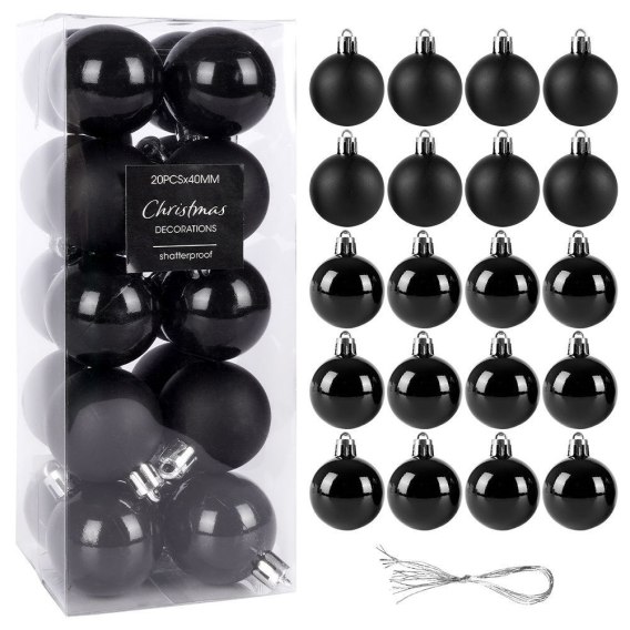 - Zestaw 20 sztuk nietłukących się bombek w kolorze czarnym.