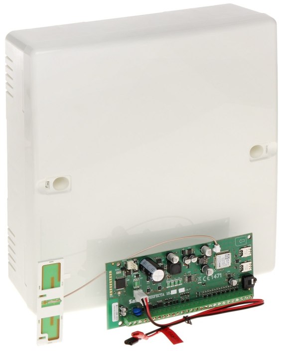 Zestaw centrali alarmowej PERFECTA-16-SET-A zawierający płytę centrali, obudowę OPU-4-P i antenę GSM
