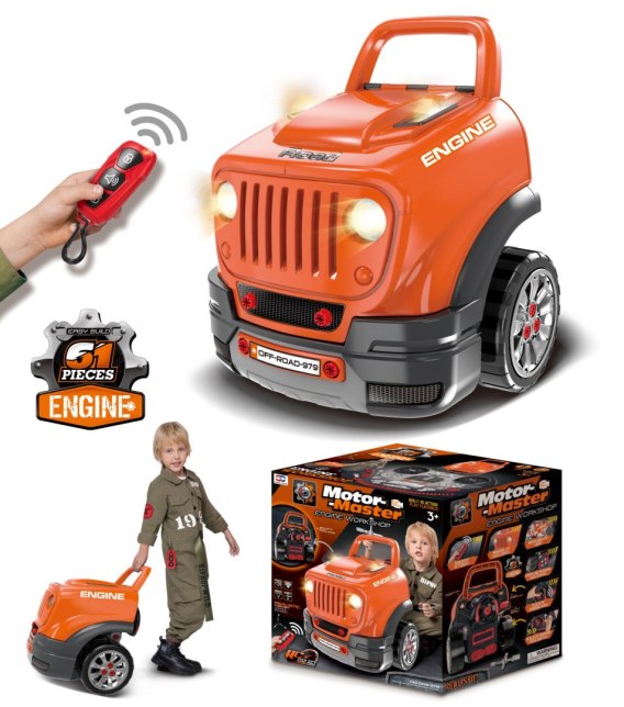 Zestaw zawiera 61 elementy, w tym: - przednią część pojazdu z rozkręcanym silnikiem, - koła z kołpakami, - składany mini podnośnik, - śrubki, - narzędzia, - pilot, - naklejki dekoracyjne, - instrukcja. |