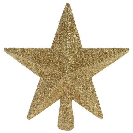 Szpic na choinkę w kształcie gwiazdy o wymiarach 19 x 19,5 cm. Wykonany w kolorze złotym z mieniącym się brokatem. Doskonały jako efektowny czubek dla świątecznej choinki.