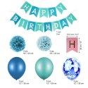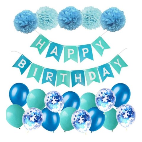• zestaw dekoracji składa się z balonów, pomponów oraz girlandy Happy Birthday,
