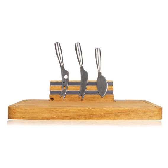 W skład zestawu wchodzi: dębowa deska do serwowania z magnetyczną listwą i schowkiem na noże, 3 małe noże: nóż do serów twardych, o krótkiej, ostrej klindze, nóż do serów miękkich cheesy o rozwidlonym czubku i klindze przypominającej ser z dziarami oraz nóż do serów miękkich o rozwidlonym czubku.