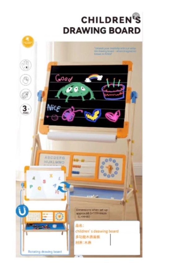 Duży drewniany zestaw składający się z tablicy kredowej, magnetycznej, liczydła, zegara, magnesów oraz papieru malarskiego to propozycja dla dzieci od 3-go roku życia. Tablice umiejscowione są dwustronnie na drewnianej solidnej konstrukcji. Biała tablica służy do pisania pisakiem i przyczepiania magnesów. Na czarnej stronie można pisać lub malować kredą. Nad tablicą magnetyczną znajduje się też rolka papieru malarskiego. Pod tablicami umiejscowiono liczydło, zegar z ruchomymi wskazówkami oraz alfabet, a jeszcze niżej mieści się półeczka, która pomieści wszystkie akcesoria malarskie dołączone do zestawu. Zabawa z tablicą pozytywnie wpływa na zdolności manualne, koncentrację i wyobraźnię. Funkcje zestawu: - odpowiedni dla dzieci powyżej 3-go roku życia, - wykonany z drewna co gwarantuje mu niezawodność, - tablica magnetyczna z magnesami w kształcie liter alfabetu, literek i znaków matematycznych, - tablica kredowa z liniami do nauki pisania, kreda w zestawie, - rolka papieru do malowania pisakami, - liczydło do nauki liczenia, - zegar z ruchomymi wskazówkami, - alfabet, - praktyczna półeczka. |