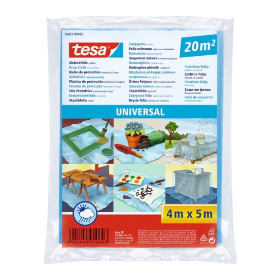 tesa® Drop Cloth Universal to duża, wielofunkcyjna folia z tworzywa sztucznego, która idealnie nadaje się do ochrony podłóg i mebli podczas malowania i renowacji.