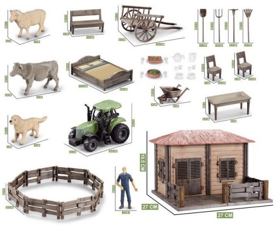 - domek rolnika ok.27 cm x 27 cm x 19 cm, - łóżko ok. 11,5 cm x 9 cm x 3,5 cm, - stół ok. 9 cm x 4,5 cm x 4 cm, - krzesło ok. 4 cm x 2 cm, - ławka ok. 7,5 cm x 5 cm x 2,5 cm, - wóz ok. 15,5 cm x 7 cm x 8,5 cm, - taczki ok. 8,5 cm x 3 cm x 5 cm, - traktor ok. 15,5 cm x 10 cm x 9,5 cm, - piesek ok. 13 cm x 8 cm x 3 cm, - figurka rolnika ok. 9,5 cm x 4,5 cm, - krówka ok. 13,5 cm x 9 cm x 4 cm, - owieczka ok. 11 cm x 8 cm x 3 cm, - opakowanie ok.37 cm x 34,5 cm x 10 cm. |