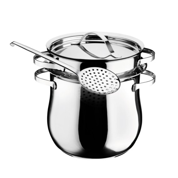 Tradycyjny kształt garnka ogranicza rozchlapywanie wody zarówno w trakcie gotowania makaronu jak i jego odlewania. Naczynie nadaje się na wszystkie rodzaje płyt kuchennych w tym na płytę indukcyjną na średnią moc. Nie należy przegrzewać garnka, który przeznaczony jest do wolnego gotowania, zbyt mocne nagrzewanie prowadzi do jego uszkodzenia. Nie należy rozgrzewać pustego naczynia, płomienie nie powinny wychodzić poza spód naczynia. Nie należy dodawać soli do zimnej wody. Naczynie nie służy do przechowywania żywności. Zaleca się myć ręcznie przy użyciu łagodnego detergentu, po umyciu należy dokładnie osuszyć naczynie. Materiał: stal nierdzewna 18/10. Opakowanie: papierowa opaska, torebka foliowa.