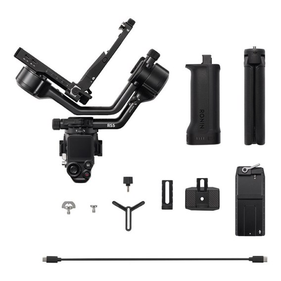 Gimbal DJI RS 5 z zamontowanym aparatem na tle gradientowego tła i hasłem Prowadź każde ujęcie