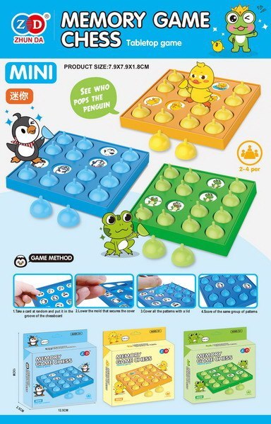 - dwupoziomowa plansza ok. 8 cm x 8 cm x 0,8 cm, - karta z obrazkami żabek ok. 7 cm x 7 cm, - pachołki ok. 1,5 cm x 1 cm, - opakowanie. 12,7 cm x 13 cm x 2,5 cm. |