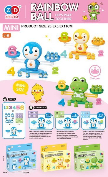 - pingwin na podstawce z wagą szalkową, - odważniki w postaci pingwinów (2 x pojedynczy pingwin, 2 x podwójny pingwin, 1 x potrójny pingwin), - cyfry od 1 do 6, - karta z zadaniami matematycznymi. |