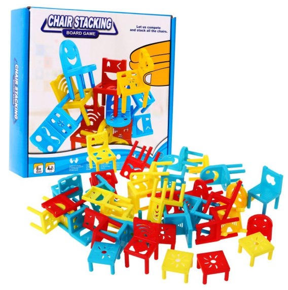 | Gra polega na budowaniu wieży z krzeseł. Gracze układają różnokolorowe krzesła na sobie, im wyżej, tym lepiej. Ważne, żeby podczas układania nie dotykać ręką krzeseł znajdujących się już na wieży. Konstrukcja musi być stabilna. Wygrywa ten kto pierwszy ułoży wieżę. Gra rozwija koncentrację i zręczność, uczy uwagi i cierpliwości. Gra przeznaczona od 6 roku życia, posiada certyfikat CE. Całość zapakowana w kolorowe pudełko idealnie nadaje się na prezent. Gra dla 1-4 graczy. |
