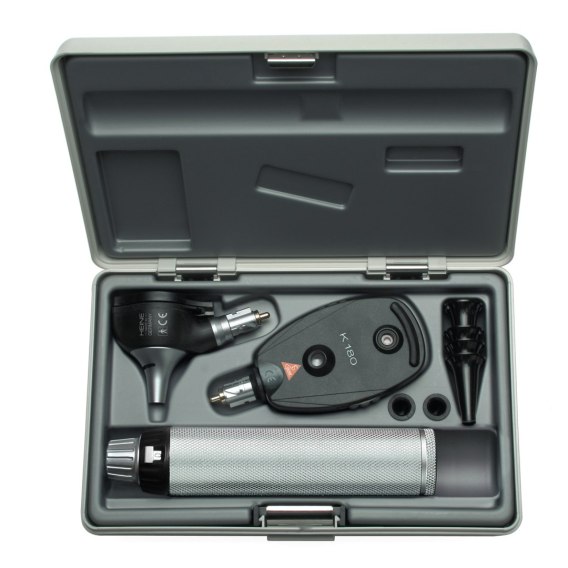 Kompletny zestaw zawiera: oftalmoskop K 180 otoskop światłowodowy K 180 1 zestaw wzierników wielokrotnego użytku (B-000.11.111) twarde etui Rękojeść bateryjna BETA z żarówką LED