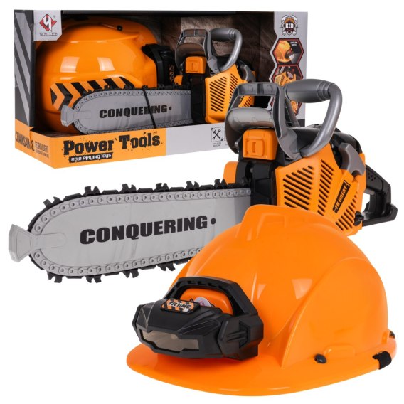 Interaktywny zestaw piła mechaniczna z efektami dźwiękowymi i kaskiem z latarką to propozycja dla dzieci od 3-go roku życia. Piła jest w pełni bezpieczna dla dzieci. Została wykonana z najlepszej jakości tworzywa sztucznego i nie posiada ostrych krawędzi. Łańcuch został wykonany z gumy. Aby uruchomić piłę, należy pociągnąć linkę rozruchową, usłyszymy wówczas odgłos odpalania silnika. By włączyć łańcuch, należy wcisnąć i przytrzymać dolny guzik na rączce. Łańcuch zacznie się obracać i wydawać odgłosy cięcia. Do zestawu dołączono kask z regulowaną lampką oraz gumką na brodę. Piła zasilana jest bateriami tupu 3 x AAA 1,5 V, baterii brak w zestawie. Kask zasilany jest bateriami typu 3 X AG13, baterie w zestawie. Funkcje zestawu: - efekty dźwiękowe (odpalanie silnika, odgłosy cięcia), - efekty świetlne - lampka na kasku, dioda na przodzie piły, - obrotowy gumowy łańcuch. |
