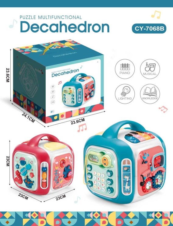 - po bokach kostki znajdują się pałąki z obrotowymi elementami do ćwiczenia paluszków dziecka. Funkcje zabawki: - odpowiednia dla dzieci od 3-go roku życia, - wykonana z najlepszej jakości plastiku w żywych kolorach, - zasilana bateriami 3 x AA 1,5 V (brak w zestawie), - efekty dźwiękowe: odgłos miksera, wesołe piosenki, melodie, odgłos nut, odgłosy zwierząt, pojazdów, nazw liczb, odgłos kręcenia kół zębatych, nazwy zwierząt i pojazdów, liczb, - efekty świetlne: podświetlany bębenek, podświetlane klawisze pianinka, - wygodna rączka do przenoszenia, - nauka kolorów, kształtów, nazw przedmiotów, - trening dla malutkich paluszków dziecka. |