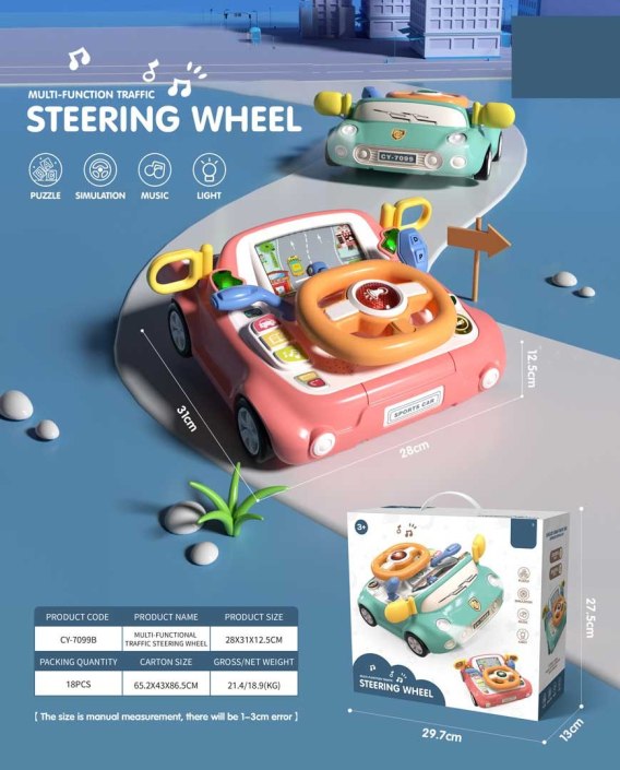 Interaktywna zabawka w kształcie autka z efektami dźwięku i światła dla dzieci powyżej 3-go roku życia. Zabawkowe autko do nauki zasad ruchu drogowego wykonane zostało z najlepszej jakości plastiku w żywych kolorach. Nie posiada ostrych krawędzi, jest w pełni bezpieczne dla malucha. Z przodu autka mamy świecące lampy, a pod spodem pojazdu znajdują się przyssawki. W środku autko posiada ruchomą kierownicę z podświetlanym klaksonem, dźwignię biegów, podświetlane migacze, sygnalizację jazdy (zielony, żółty, różowy), przyciski dźwiękowe z odgłosami wydawanymi przez pojazd, muzyczka, a na ekraniku znajdującym się za szybką przesuwającą się drogę i autko, którym dziecko musi kierować. Po bokach samochodu znajdują się duże lusterka. Zabawka zasilana jest bateriami typu 3 X AA 1,5 V (brak w zestawie) Funkcje zabawki: - przeznaczona dla dzieci od 3-go roku życia, - wykonana z najlepszej jakości plastiku i nie posiada ostrych krawędzi, - efekty świetlne: przednie reflektory, kierunkowskazy, klakson, sygnalizator jazdy, - efekty dźwiękowe: klakson, migacze, przycisk start, odgłosy pojazdu, melodie, - 4 przyssawki na spodzie pojazdu, - żywa kolorystyka, - uczy zasad ruchu drogowego, - rozwija koordynację ręka-oko, - ruchoma kierownica, - ruchomy pojazd na ekraniku, - ruchoma droga na ekraniku. |
