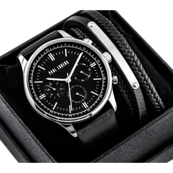 Komplet prezentowy męski, który łączy elegancję z ponadczasowym stylem. Zawiera zegarek marki Paul Lorens, na czarnym pasku, z klasyczną, czarną tarczą ozdobioną srebrnym indeksem, co nadaje mu subtelną i wyrafinowaną estetykę. Srebrna koperta zegarka doskonale komponuje się z całością, tworząc wyjątkowy design. Zegarek charakteryzuje się wodoszczelnością WR30, co zapewnia jego funkcjonalność i trwałość. Komplet zawiera również skórzaną, czarną bransoletę, która stanowi doskonałe uzupełnienie całości. To idealny wybór na święta - elegancki, męski i wyjątkowy prezent, który zachwyci każdego..