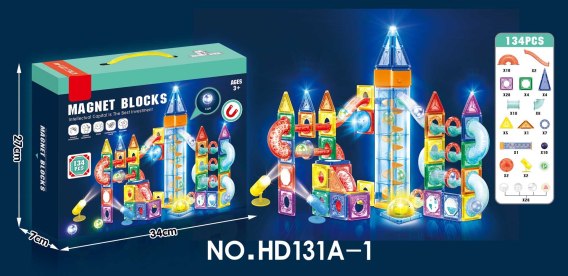 - 32 x klocki magnetyczne - kwadraty, -10 x klocki magnetyczne trójkąty, o różnych rozmiarach, - rurki, - pozostałe elementy konstrukcyjne, - 4 x świecące piłki, - 10 piłek, -2 x świecące dyski, - 2 x reflektor, - naklejki, - instrukcja. |