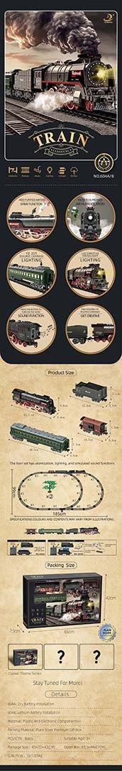 Zestaw retro kolejka z funkcją dymu i odgłosami jazdy, a także torami w zestawie to propozycja dla dzieci od 3-go roku życia. Zabawka zasilana jest akumulatorem typu 3,7 V 1200 mAh (w zestawie). Podczas jazdy lokomotywa wypuszcza z komina i po bokach dym (po wcześniejszym uzupełnieniu jej wodą - pipetka do wody dołączona do zestawu, dodatkowo świeci się światełko zamontowane w części frontowej. Tory posiadają łatwy sposób łączenia, dzięki temu są bezpieczne i wytrzymałe w użytkowaniu. Funkcje zestawu: - odpowiedni dla dzieci od 3-go roku życia, - dym wydobywający się z komina i po bokach, - kolejka jeździ do przodu, do tyłu, zatrzymuję się, - reflektor z przodu lokomotywy, - odgłosy jazdy, - możliwość wyłączenia odgłosów lokomotywy. |