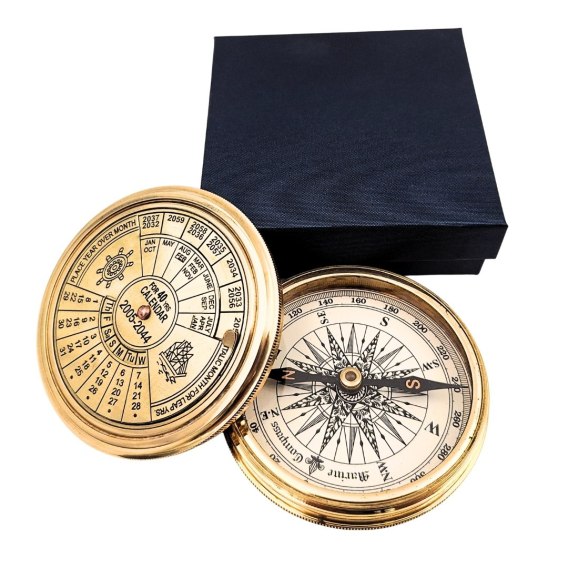 Kompas Mosiężny Retro + 40-letni Kalendarz w Eleganckim Pudełku - Prezent dla Żeglarza i Szefa - COM101