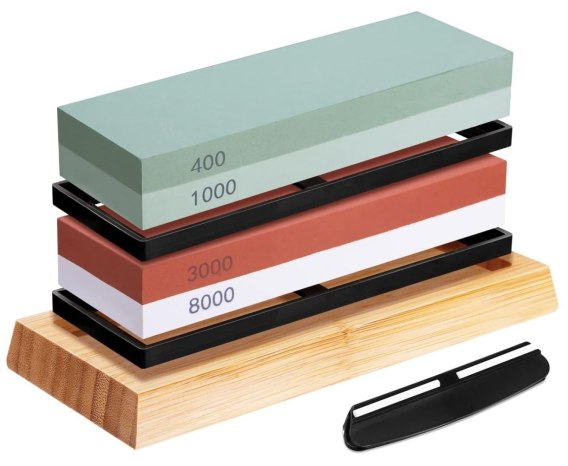 W zestawie: dwa kamienie z korundu, prowadnica do utrzymywania kąta, bambusowa podstawka, gumowe podkładki