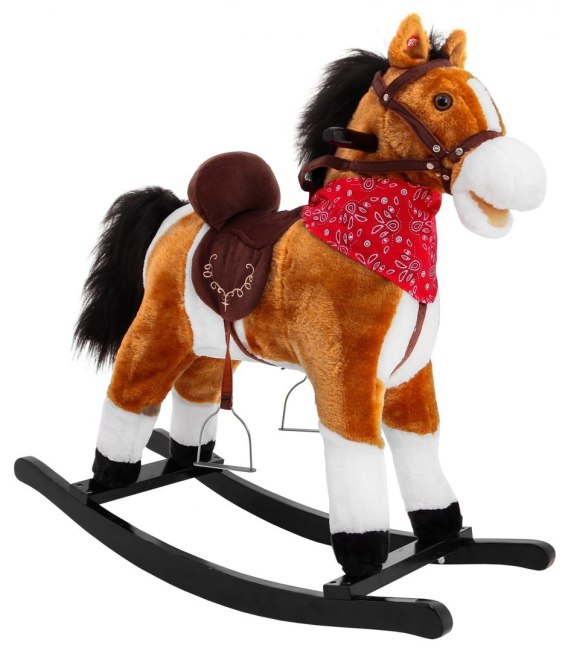 Pluszowy koń na biegunach z efektami dźwiękowymi dla dzieci od 3-go roku życia. Koń z pewnością przypadnie do gustu każdemu malcowi. Jest mięciutki w dotyku, posiada siodło ze strzemionami, lejce i chustę na szyi. Na lewym uchu konia znajduje się czujnik, który uruchamia odgłosy rżenia i galopu oraz porusza ogonem i mordką. Na prawym uchu czujnik uruchamia kowbojską piosenkę oraz porusza ogonem i mordką. Zabawka zasilana jest bateriami typu 3 x AA 1,5V, baterii brak w zestawie.