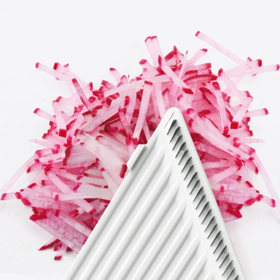 Uniwersalna szatkownica do warzyw 2w1 w kolorze białym posiada wysokiej jakości ostrze ze stali nierdzewnej wykonane w Niemczech. Dodatkowo posiada dwie wymienne wkładki umożliwiające cięcie plastrów o grubościach 2mm, 3mm oraz pasków o grubości około 2,3mm i szerokości 1mm. Żadne warzywo nie oprze się tej szatkownicy. A oprócz warzyw można na niej kroić dojrzały ser. Dzięki poręcznemu kształtowi i kompaktowej formie szatkownica wygodnie spoczywa w dłoni i z łatwością mieści się w kuchennej szufladzie, nie zajmując wiele miejsca. Rama została wykonana z wysokiej jakości tworzywa sztucznego. Zalecane jest mycie ręczne. Produkt wykonany w Niemczech.