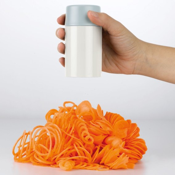 Krajalnica do tworzenia ozdobnych spiralek z warzyw i owoców. W zestawie znajdują się dwa pojemniki, każdy z innym rodzajem ostrzy przeznaczonych do nitek lub wstążek. Do tego zawarty został tłok dociskowy z gwintem i zębami itrzymującymi cięte warzywo. Produkt wykonany z materiału ABS, ostrza ze stali nierdzewnej. Zalecane jest mycie ręczne.