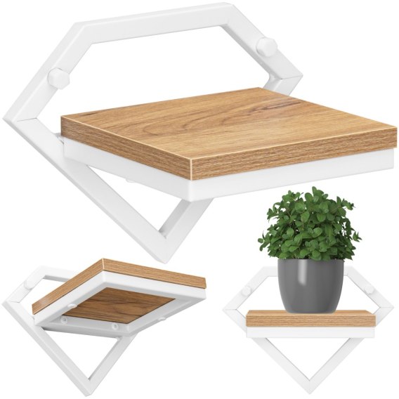 Półka z płyty laminowanej w kolorze dąb craft dodaje naturalnego akcentu, który świetnie kontrastuje z białą, metalową konstrukcją.