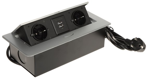 Listwa zasilająca meblowa wyposażona w 2 gniazda sieciowe z uziemieniem oraz 2 porty USB.