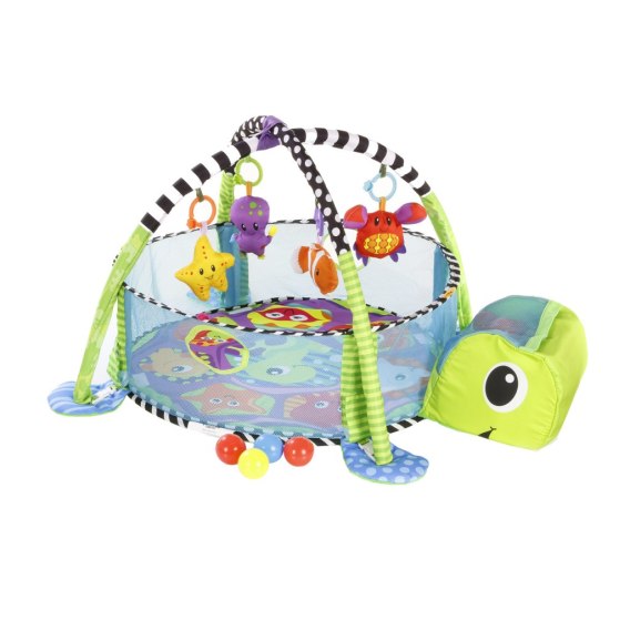 Miękka pluszowa mata / 30 kolorowych piłeczek w zestawie / 4 zabawki: krab, rozgwiazda, ośmiornica, rybka / Elastyczne pałąki przypinane na klamrę / Podnoszona siatka zabezpieczająca z otworami / 3w1: mata, kojec, basen z piłkami.