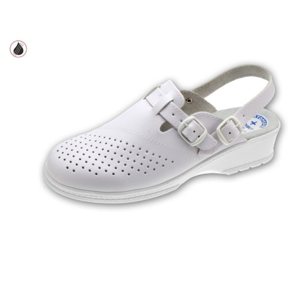 Obuwie damskie na koturnie, na spodach przeciwpoślizgowych, z profilem ortopedycznym. Wyściółka i cholewka skórzana, możliwość regulacji tęgości. Pasek na piętę, cholewka z perforacją