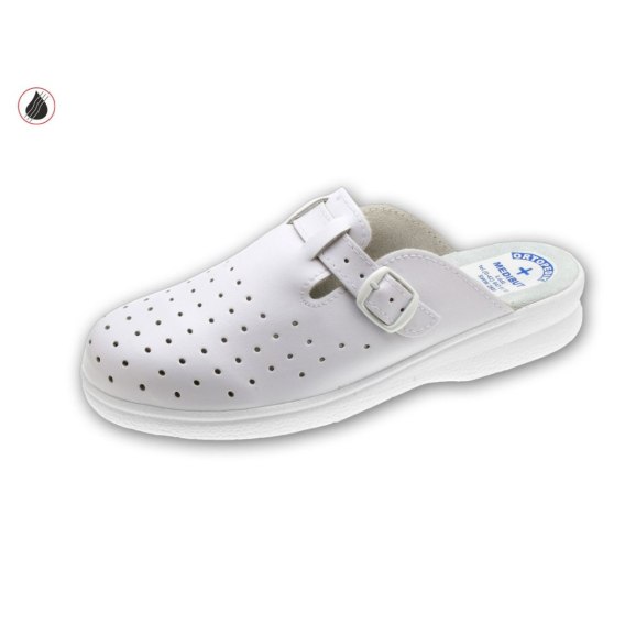 Obuwie damskie na spodach przeciwpoślizgowych z profilem ortopedycznym. Wyściółka i cholewka skórzana, możliwość regulacji tęgości. Cholewka z perforacją