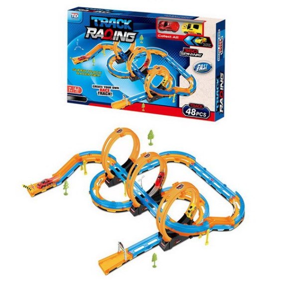 Duży, ekstremalny tor wyścigowy z ostrymi zakrętami, pętlami i dwoma szybkimi autkami w zestawie, to propozycja dla dzieci od 3-go roku życia. Zestaw składa się z 48 elementów do samodzielnego montażu. Na torze znajdują się odcinki proste, ostre zakręty z barierkami zabezpieczającymi przed wypadaniem pojazdu z trasy, a także trzy pętle 360 stopni. Pojazdy posiadają napęd pull back. |