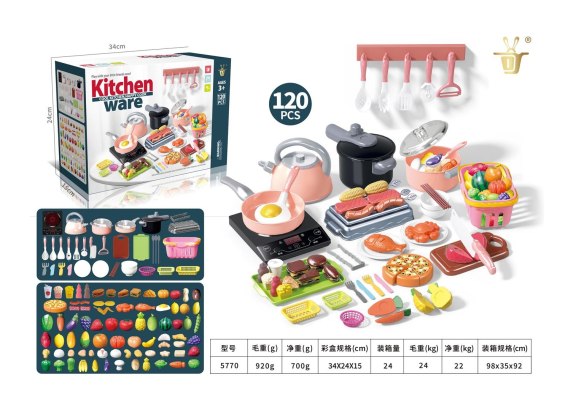 - kuchenka indukcyjna, - duży koszyk zakupowy, - garnek z pokrywką, - patelnia z pokrywką, - szybkowar, - czajnik - grill, - deska do krojenia, - tacka, - 2 x miseczki, - 3 x mały koszyczek, - szczypce, - łyżka do makaronu, - chochelka, - 2 x łopatka, - kółko do pizzy, - obieraczka, - tasak, - 4 x patyczki, - 2 x widelczyk, - 2 x nożyk, - 2 x talerzyk, - atrapy produktów spożywczych: napój w kubku, pizza na rzepy, kanapka, jajko sadzone, popcorn, frytki, ketchup, sos, hot dog, hamburger, tost, ananas na rzepy, truskawka na rzepy, sałata na rzepy, brzoskwinka na rzepy, cytryna na rzepy, pomidor na rzepy, , arbuz na rzepy, papryka czerwona na rzepy, winogrono na rzepy, marchewka na rzepy, banan na rzepy, 3 x szaszłyk na patyku, bakłażan na rzepy, 2 x beza, 2 x pierożek, dynia, bakłażan, winogrono, groszek zielony, brokuł, kukurydza, ziemniak, 3 x sałata, pomidor, papryka czerwona i zielona, kiwi, pieczarka, truskawka, pomarańcza, ananas, marchew, banany, orzech laskowy, cytryna, nóżka z kurczaka, skrzydełko z kurczaka, kotlet, 3 x ciastko, chleb, chałka, rogal. |