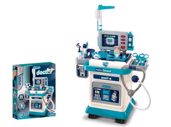 Interaktywny, bogato wyposażony zestaw lekarski z efektami dźwiękowymi i świetlnymi, dla dzieci od trzeciego roku życia. Zestaw składa się z solidnie wykonanego, lekkiego wózka, na kółeczkach z poręcznym uchwytem i narzędzi lekarskich. Możemy wymieniać zdjęcia RTG czy tomografu. Na ekranie monitorującym za pomocą przycisków można aktywować odgłosy bicia serca, tętna, czy tomografu ,a także alarmu. Podświetla się też przycisk z serduszkiem. Panel monitorujący zasilany jest bateriami typu 2 X AA 1,5 V (brak w zestawie). Termometr zasilany jest bateriami typu 2 X LR44 (w zestawie).