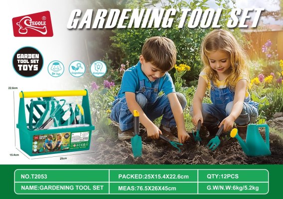 Zestaw małego ogrodnika dla dzieci od trzeciego roku życia. Zestaw wykonano z dbałością o szczegóły, zabawkowe narzędzia przypominają prawdziwe, ale są bezpieczne dla dzieci. W zestawie znaleźć możemy łopatkę, widełki, konewkę kielnię i grabki Wszystkie narzędzia zapakowane są w walizkę do przenoszenia. Zestaw wykonany został z najlepszej jakości tworzywa sztucznego i jest idealny zarówno dla chłopca jak i dziewczynki.