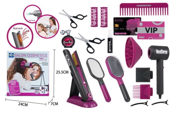 Interaktywny, bogato wyposażony zestaw fryzjerski z suszarką posiadającą wymienne dysze i prostownicą do włosów na baterie, to propozycja dla dzieci od 3- go roku życia. W zestawie znaleźć możemy szeroką gamę narzędzi niezbędnych w pracy fryzjera w tym suszarkę, prostownicę, nożyczki, grzebienie do włosów i inne akcesoria. Suszarka do włosów wydaje odgłos suszenia i emituje strumień powietrza. Prostownica posiada efekty świetlne oraz odgłosy towarzyszące prostowaniu włosów. Suszarka do włosów zasilana jest bateriami typu 2 x AA (brak w zestawie), prostownica bateriami 2 x AAA (brak w zestawie). Funkcje zestawu: - suszarka z wymiennymi nasadkami (dyfuzor, nasadka skupiająca, końcówka Root Boost) - suszarka emituje strumień powietrza, - suszarka wydaje odgłosy suszenia, - prostownica posiada suwak do zamykania i otwierania, - prostownica posiada oświetlenie, - prostownica wydaje odgłosy charakterystyczne dla prostowania włosów, - praktyczny stojak na suszarkę lub prostownicę. |