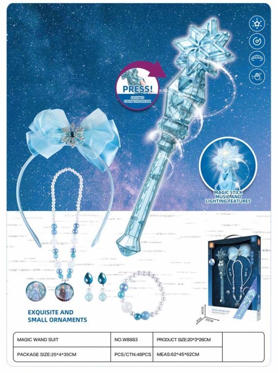 - różdżka ok. 26 cm x 7 cm, - opaska do włosów ok. 20 cm x 12 cm, - korale ok. 22 cm x 3 cm x 1 cm, - bransoletka o średnicy ok. 5,5 cm, - pierścionek o średnicy ok. 1,5 cm, - kolczyki ok. 4,5 cm x 1,3 cm, - opakowanie ok. 35,3 cm x 25 cm x 4 cm. |