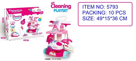 - wózek, - interaktywny odkurzacz, - zmiotka mała i duża, - szufelka mała i duża, - ściągaczka do mycia szyb, - opakowanie z kuleczkami ze styropianu, - buteleczka z płynem do mycia, - buteleczka ze spryskiwaczem, - gąbka. - naklejki dekoracyjne. |