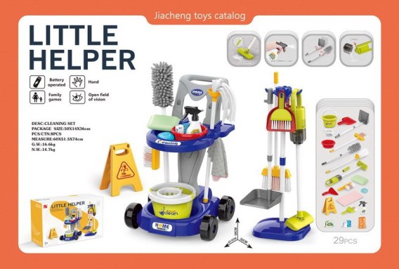 - wózek do sprzątania na kółkach, - tabliczka „uwaga śliska podłoga", - wiaderko, - mop, - szczotka do kurzu, - zmiotka i szufelka, - skrobaczka, - ściereczka, - gąbka ostra, - spryskiwacz, - mydło, - odkurzacz pionowy, - duża szufelka, - duża zmiotka, - wieszak na przedmioty, - miska, - 3 x kartoniki ze środkami czyszczącymi, - końcówka szczelinowa do odkurzacza, - saszetka z kulkami styropianowymi, - naklejki dekoracyjne. |