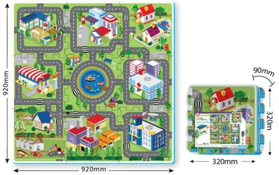 Zestaw składa się z 9 puzzli z których można ułożyć matę przedstawiającą lotnisko z samolotami oraz pasami startowymi i lądowiskiem. Do zestawu dołączono również piankowe elementy samolotu do samodzielnego złożenia.