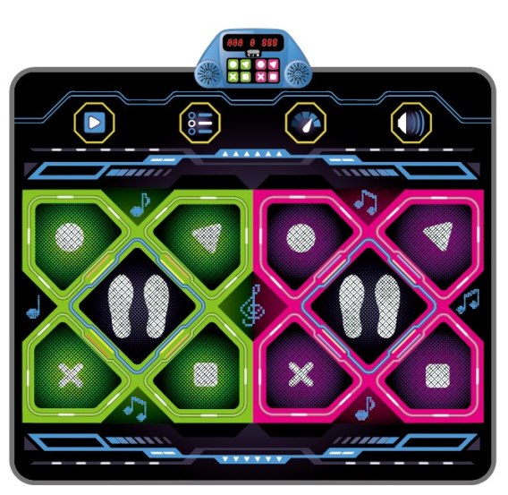 Mata taneczno-muzyczna, dwuosobowa dla dzieci od 3-go roku życia. Mata posiada antypoślizgową warstwę pod spodem, a z wierzchu jest kolorowa, ma wbudowany wyświetlacz oraz przyciski dotykowe. Tańczyć jednocześnie mogą dwie osoby, powierzchnia do tańca jest swobodna. Na górze maty znajduje się wyświetlacz, na którym pojawia się punkty, poziomy gry oraz podświetlane pola z różnymi kształtami i dwa głośniki. Wyświetlacz zasilany jest bateriami typu 3 x AA 1,5V (brak w zestawie). Na macie umiejscowiono dwa miejsca postojowe z rysunkiem stóp oraz osiem pól dotykowych z kołem, trójkątem, krzyżykiem i kwadratem. Mata posiada tryb jednego lub dwóch graczy. Mamy osiem różnych podkładów muzycznych do wyboru i 3 stopnie trudności. W trybie dla dwóch graczy możemy ustawić wyświetlanie identycznych wzorów dla graczy, lub innych, jest też tryb pamięciowy. Mata poprawia koordynację ruchową, doskonali słuch muzyczny i jest świetnym sposobem na wspólne aktywne spędzanie czasu. Funkcje: - dla dzieci od 3-go roku życia, - dwuosobowa mata taneczna, - poprawia koordynację ruchową i słuch muzyczny, -doskonały sposób na wspólne spędzanie czasu, - konstrukcja antypoślizgowa, - swobodna powierzchnia do tańczenia, - wyświetlacz z efektami dźwiękowymi i świetlnymi, - tryb gry jednoosobowy, - tryb gry dwuosobowy, - 8 podkładów muzycznych, - 3 stopnie trudności, - tryb pamięciowy, - regulacja głośności. |