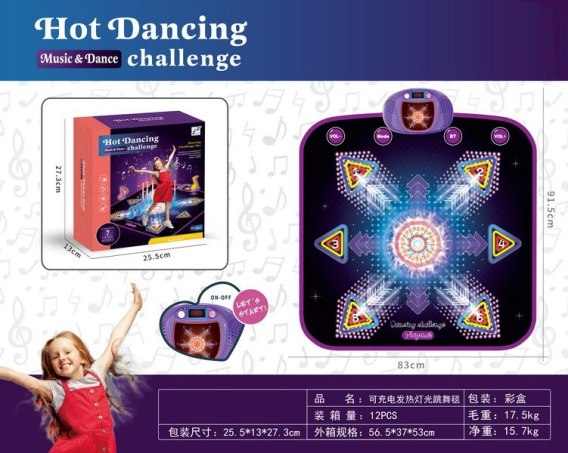Mata do tańca z Bluetooth, oświetleniem i podgrzewaniem dla dzieci powyżej 3-go roku życia. Jest miękka i kolorowa, od spodu posiada warstwę antypoślizgową. Środek maty może nagrzewać się do 45 stopni by ogrzać zmarznięte stopy Twojej pociechy. Mata działa w 5 trybach: swobodnego tańca, gaszenia światełek na macie (tryb 2 i 3), pamięciowym i perkusyjnym. Możemy połączyć matę z telefonem przez Bluetooth. Mata zasilana jest akumulatorem typu 7,4 V 1800 mAh (w zestawie).