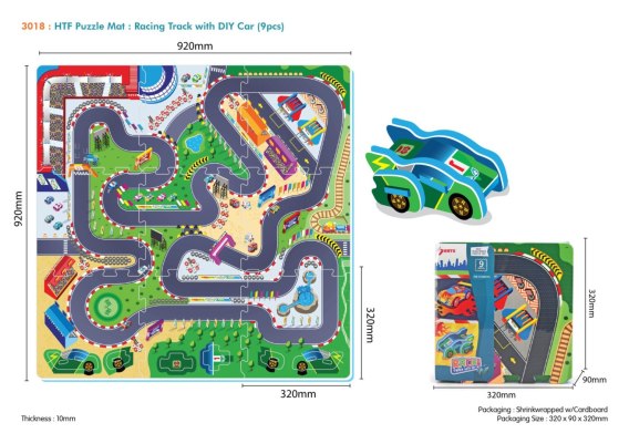 Zestaw składa się z 9 puzzli z których można ułożyć matę na podłogę chroniącą przed zimnem oraz amortyzującą upadki. Gotowy tor wyścigowy będzie wspaniałym podłożem do zabawy samochodzikami. W zestawie znajdują się elementy wyścigówki do samodzielnego złożenia.