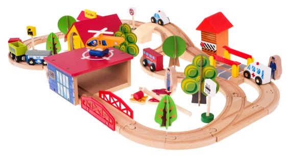 Duża drewniana kolejka dla dzieci od 3-go roku życia. Zestaw zawiera 69 elementów, w tym skomplikowane kształty torów, rozjazdy, mosty, budynki, kolejkę, a nawet lądowisko dla helikoptera. Zestaw został wykonany z drewna i pomalowany bezpiecznymi, nietoksycznymi farbami. Będzie służył na wiele lat, a różnorodność elementów nie pozwoli znudzić się zabawą. |