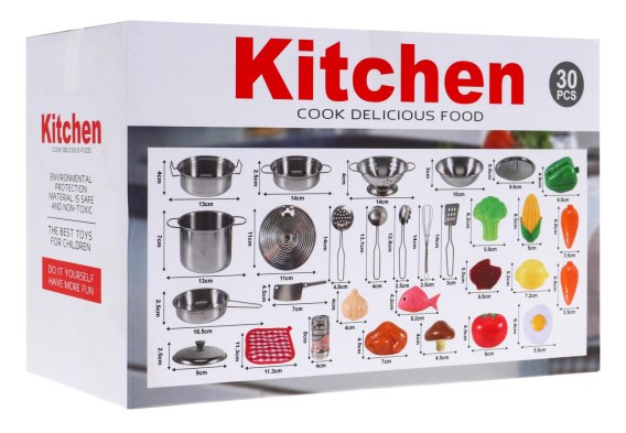 - metalowy garnek ok. 13x13x4cm, - metalowy garnek ok. 14x14x2.5cm, - metalowy durszlak ok. 14x14x4cm, - metalowa miska ok. 10x10x3cm, - metalowa pokrywka ok. 9.8x9.8.2.5cm, - metalowa podstawka ok. 11x11cm, - metalowy garnek ok. 13x13x7cm, - metalowa patelnia ok. 16.5x10x2.5cm, - metalowa pokrywka ok. 9x9x2.5cm, - metalowa łyżka cedzakowa ok. 14x4.8cm, - metalowa chochla ok. 13.1x4cm, - metalowa łyżka do makaronu ok. 12.8x2.5 cm, - metalowo trzepaczka ok. 14x2.5cm, - metalowa łopatka ok. 14x3cm, - metalowy tasak ok. 7x4.5cm, - metalowa pieprzniczka (z trzema rodzajami otworów) ok.8x4x4cm, - materiałowa podstawka ok. 11.3x11.3cm, - plastikowa papryka ok. 6.5x4.9cm, - plastikowy brokuł ok. 6.2x5.9cm, - plastikowa kukurydza ok. 8.5x5cm, - 2x plastikowa marchewka ok. 6.8x3.5cm, - plastikowa cytryna ok. 7.2x5.2cm, - plastikowy stek ok. 6.8x5.5cm, - plastikowe jajko sadzone ok.6.4x5.8cm, - plastikowy pomidor ok. 6x4.5cm, - plastikowa ryba ok. 8.2x4.2cm, - plastikowy grzyb ok. 4x4.5cm, - plastikowy czosnek ok.4x4cm, - plastikowy kurczak z rożna 7x4.5cm, |