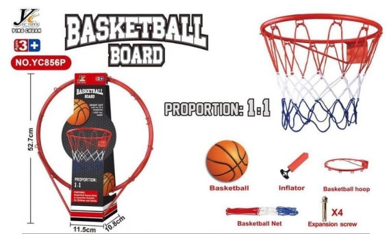 - metalowa obręcz kosza, - siatka, - śruby mocujące, - pompka do piłki z igłą, - piłka, |